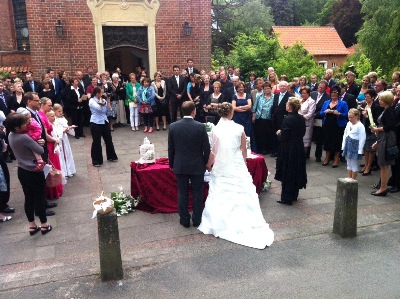 Vor einer Kirche - im Bild die Dyckburg-Kirche in Münster - hat Gisela Kötters ihren schönen und liebevoll dekorierten "Hochzeits-Tauben-Altar" aufgebaut. Brautpaar und Gäste sind von diesem stimmungsvoll-romantischen Auftritt immer überrascht und begeistert .